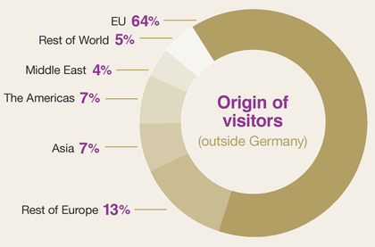 來自德國以外的參展商和觀眾的比例分別為48%和34%,海外參展商的比例繼續(xù)有所增加,但海外觀眾的比例有輕微下跌。繼德國之后參展商最多的國家分別是:意大利、土耳其、中國、荷蘭、瑞士、西班牙、奧地利、法國和美國。繼德國之后觀眾最多的國家分別是:奧地利、荷蘭、瑞典、瑞士、英國、意大利、丹麥、比利時、印度、捷克共和國和波蘭。