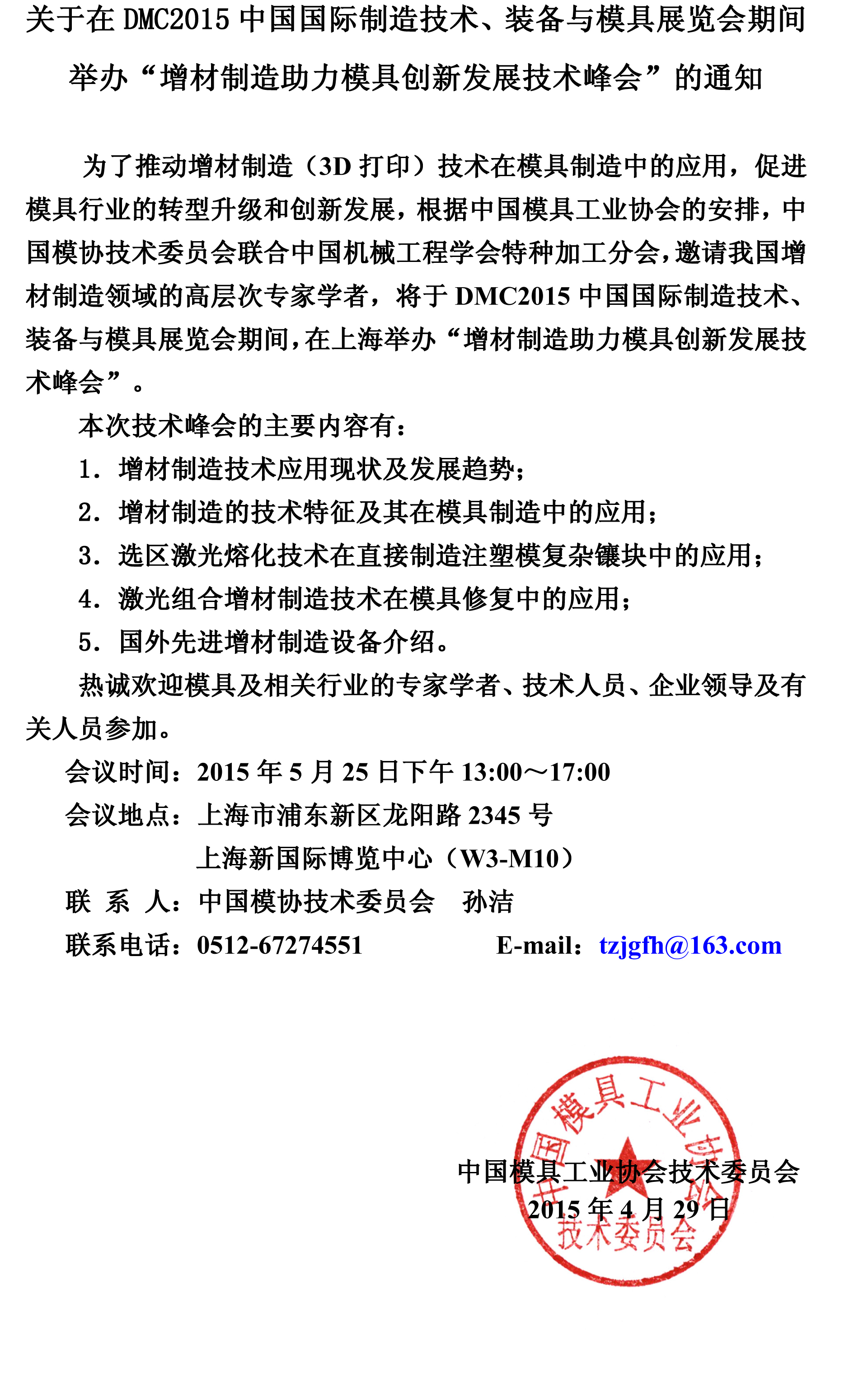 關于在DMC2015中國國際制造技術、裝備與模具展覽會期間舉辦“增材制造助力模具創(chuàng)新發(fā)展技術峰會”的通知