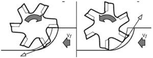 在高效切削加工中,應(yīng)盡量選用順銑加工,因?yàn)樵陧樸姇r(shí),刀具剛切入工件產(chǎn)生的切屑厚度為最大,隨后逐漸減小。在逆銑時(shí),刀具剛切入工件產(chǎn)生的切屑厚度為最小,隨后逐漸增厚,這樣增加了刀具與工件的摩擦,在刀刃上產(chǎn)生大量熱,所以在逆銑中產(chǎn)生的熱量比在順銑時(shí)多很多,徑向力也大大增加,緩解了高硬度切削時(shí)切削熱對刀具的損傷。同時(shí)在逆銑中刀刃受力狀態(tài)較順銑更為惡劣,降低了刀片的使用壽命,順銑和逆銑時(shí)刀具切入工件的過程,如圖(二)所示。
