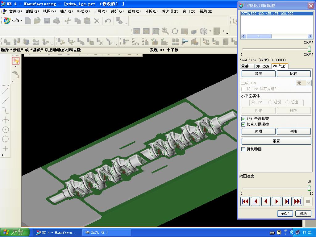 數(shù)控程序的編制應(yīng)盡量使刀具承受載荷均勻,避免刀具走刀方向的突然變化,避免因局部過切而造成刀具的損壞。通過數(shù)控編程程序補(bǔ)償機(jī)床CAM系統(tǒng)能根據(jù)加工瞬時(shí)余量的大小,自動(dòng)對進(jìn)給率進(jìn)行優(yōu)化處理,可減少刀具損壞。在加工方法上采用層銑深度優(yōu)先,這樣可降低抬刀次數(shù);刀具進(jìn)刀采用斜插入,避免刀具突然承受巨大載荷而造成刀具的損壞。盡量減少刀具的急速換向,同時(shí)考慮加工不同階段采用不同程序。粗加工中的修圓和光弧連接功能都應(yīng)去掉,這樣可減少重復(fù)刀路,提高效率。對數(shù)控粗加工程序刀路及數(shù)控程序模擬效果進(jìn)行模擬分析(見圖三),確認(rèn)數(shù)控程序刀路的可靠性,分析得出無過切及刀具碰撞現(xiàn)象。在優(yōu)化程序時(shí)盡量考慮加工余量徑向大于軸向,主要是考慮到走刀時(shí),如果刀具發(fā)生斷刀現(xiàn)象,徑向比軸向更容易扎刀。