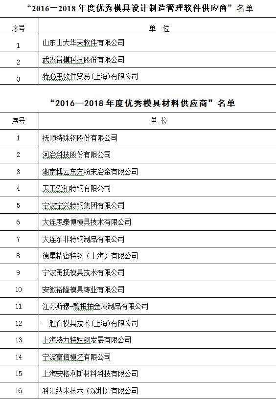 在知名品牌專業展會——中國國際模具技術和設備展覽會DMC上開展優秀供應商的評選活動,得到了各行業的廣泛認可,被評定為優秀供應商的企業,將在模具企業的采購中獲得優先推薦資格并在行業里得到廣泛的宣傳推廣,并在中國模協的官網上進行公告,至今已成定式。DMC2018期間,中國模具工業協會委托中國模協裝備委員會、數字化信息化委員會、材料委員會,本著自愿的原則,依據供應商的技術水平、在模具行業的服務能力、市場占有率的高低、模具行業服務滿意度等行業貢獻指標,并結合模具企業的意見,最終評選出21家“2016—2018年度優秀模具制造設備工具供應商”、3家“2016—2018年度優秀模具設計制造管理軟件供應商”、16家“2016—2018年度優秀模具材料供應商”(同時見www.cdmia.com.cn,diemouldchina.com.cn),具體名單如下所示,排名均不分先后。