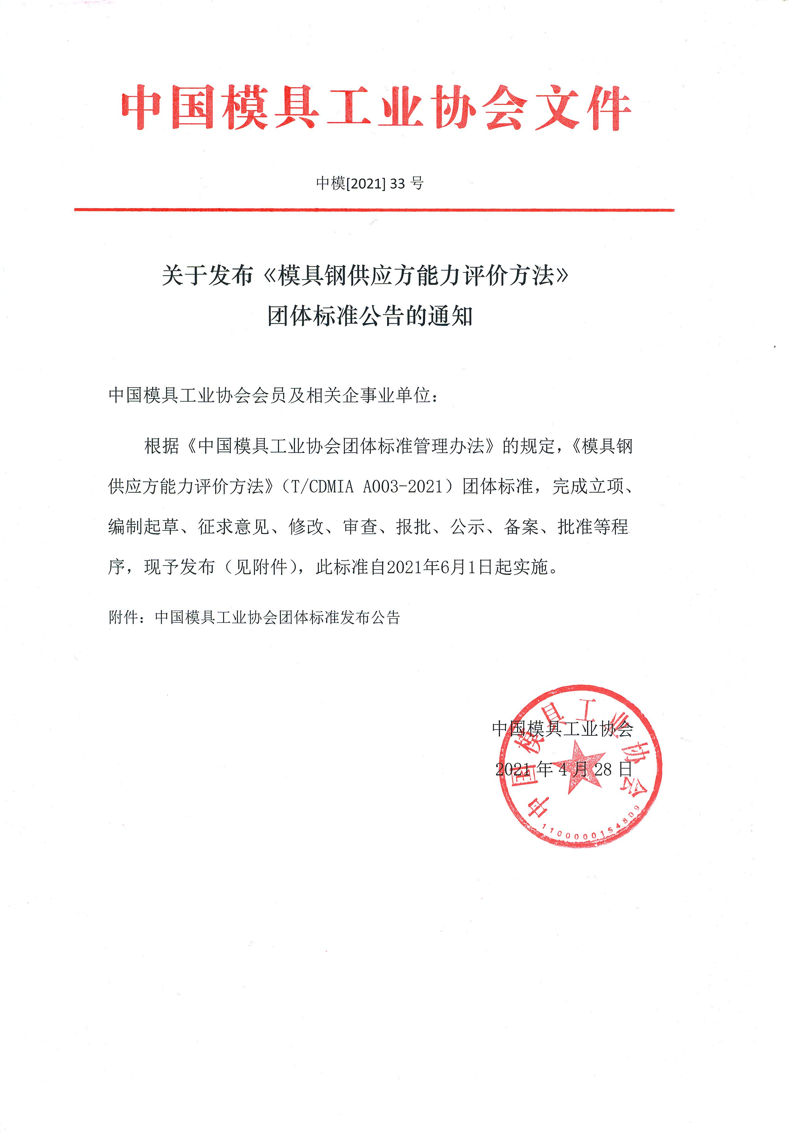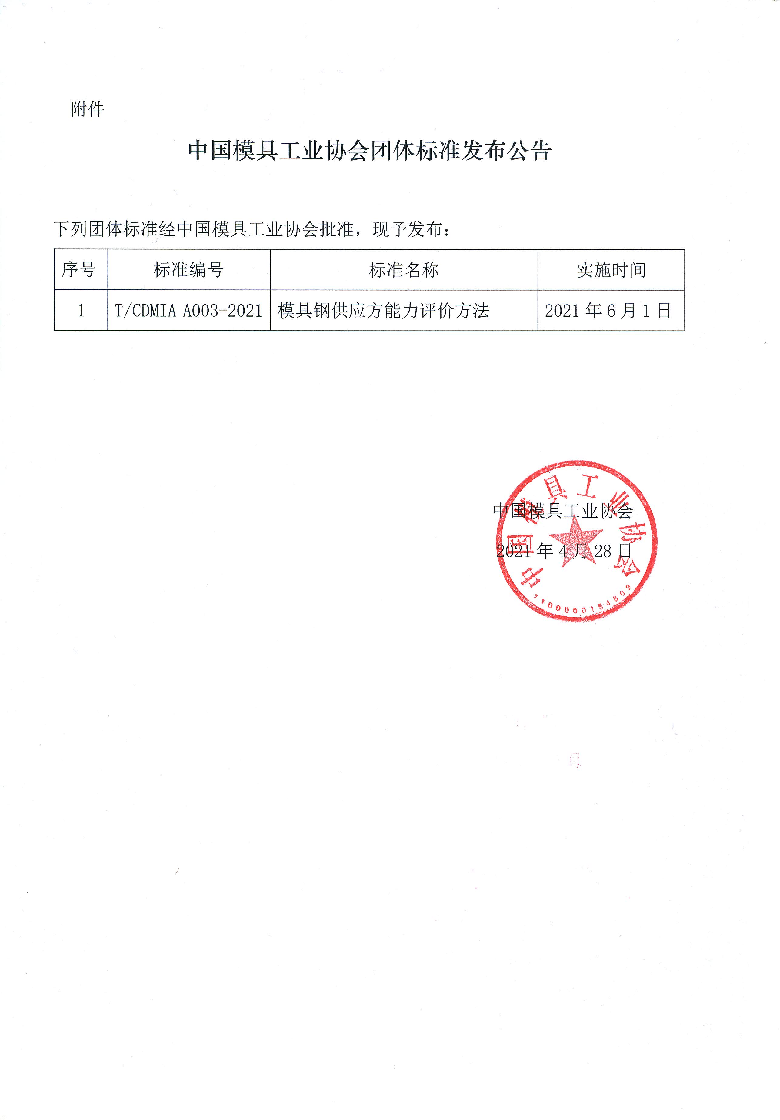 關于發(fā)布《模具鋼供應方能力評價方法》團體標準公告的通知