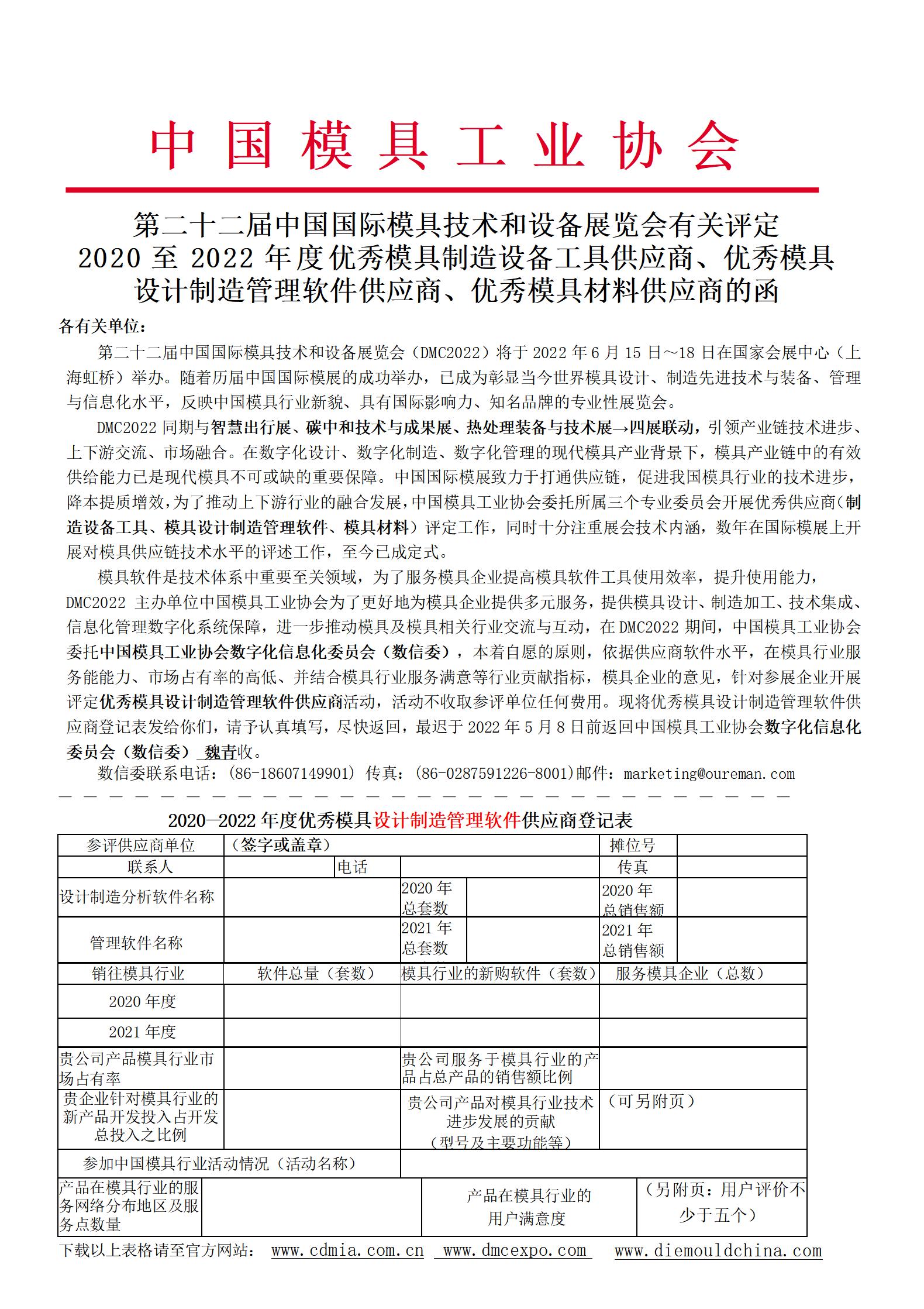 第二十二屆中國國際模具技術和設備展覽會有關評定 2020至2022年度優秀模具制造設備工具供應商、優秀模具設計制造管理軟件供應商、優秀模具材料供應商的函