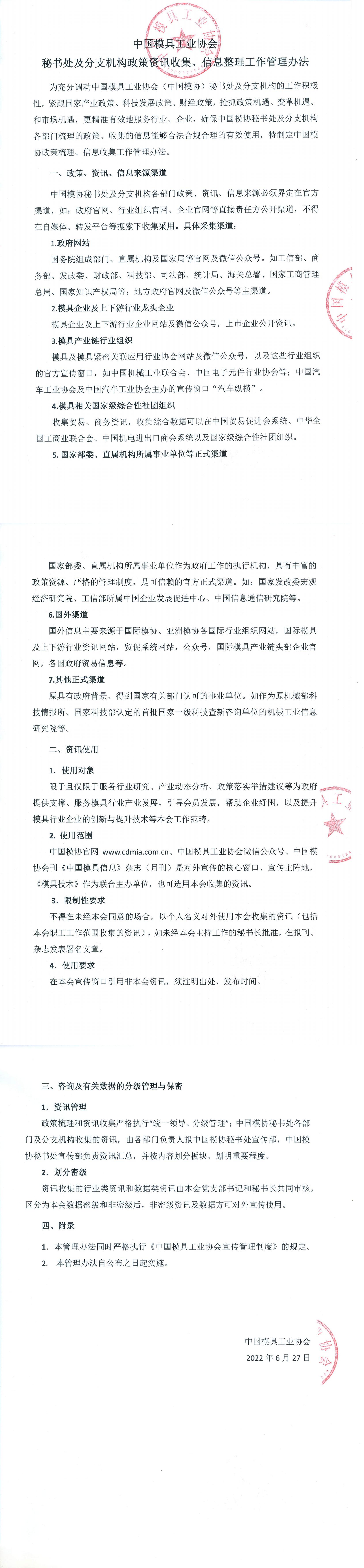 中國模具工業協會秘書處及分支機構政策資訊收集、信息整理工作管理辦法