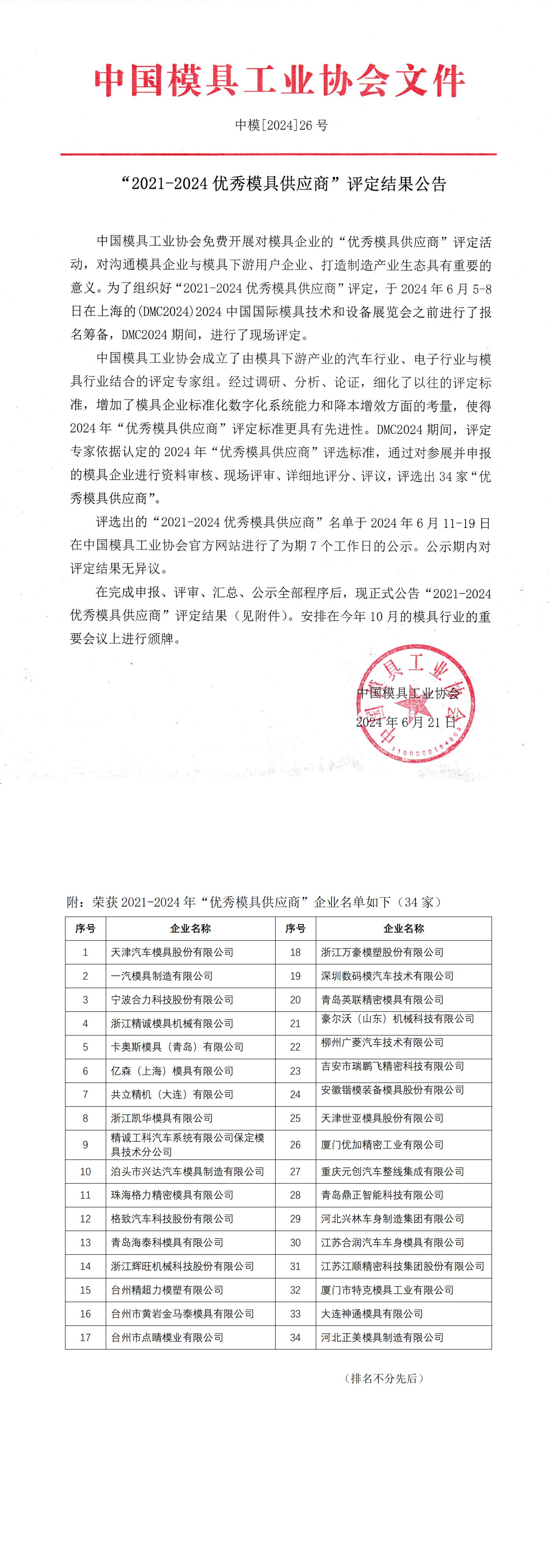 “2021-2024優(yōu)秀模具供應商”評定結果公告