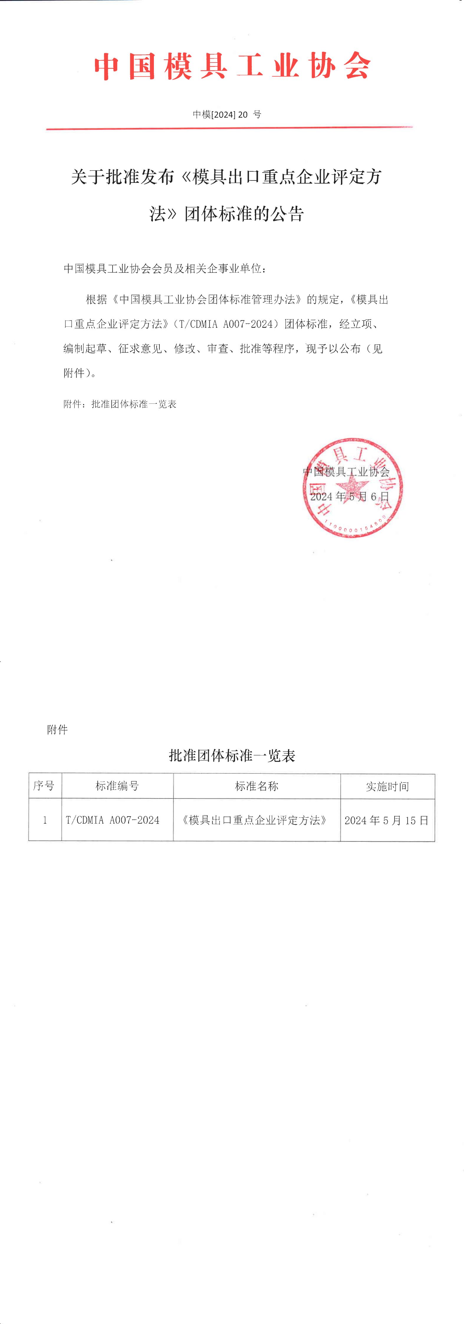 關于批準發布《模具出口重點企業評定方法》團體標準的公告